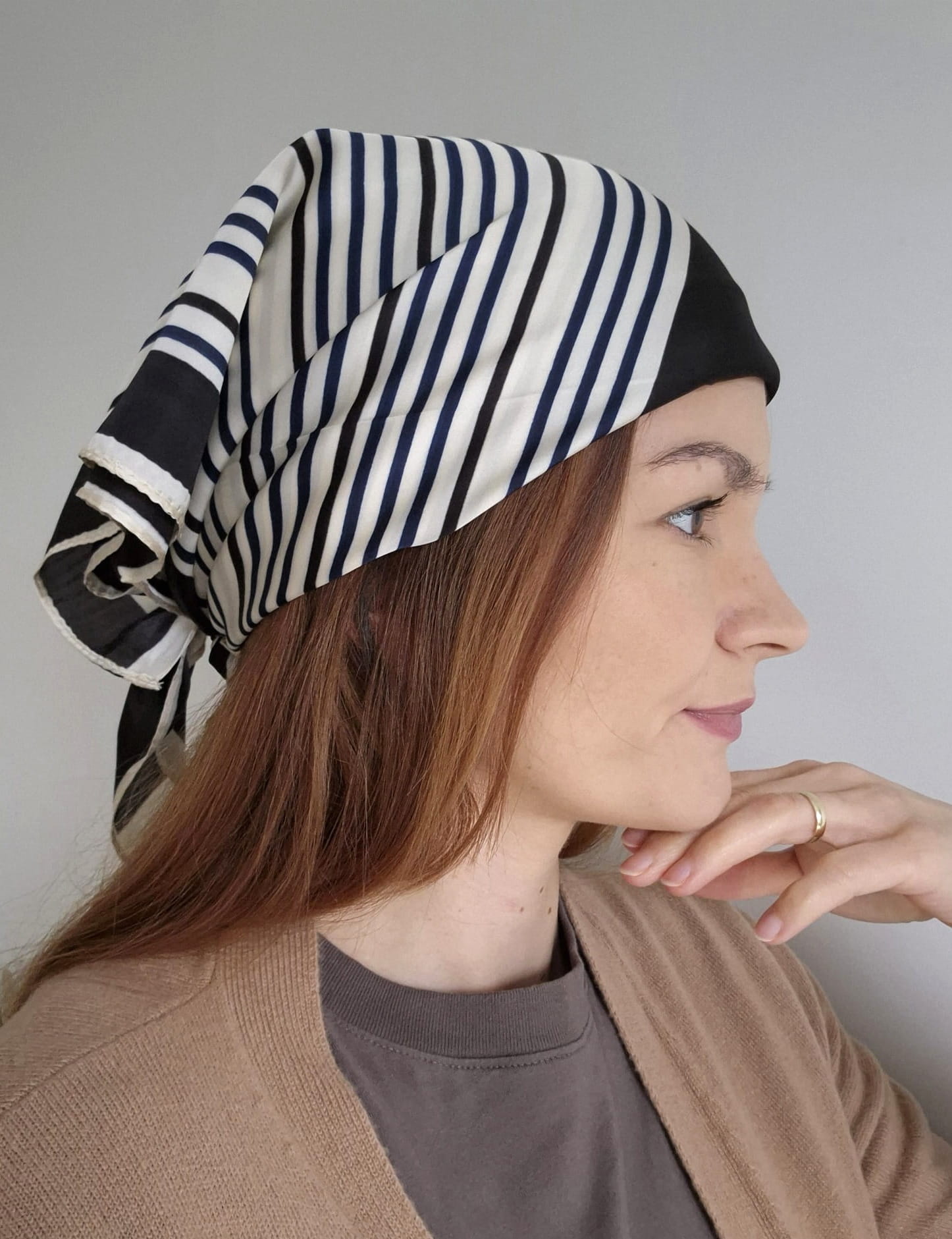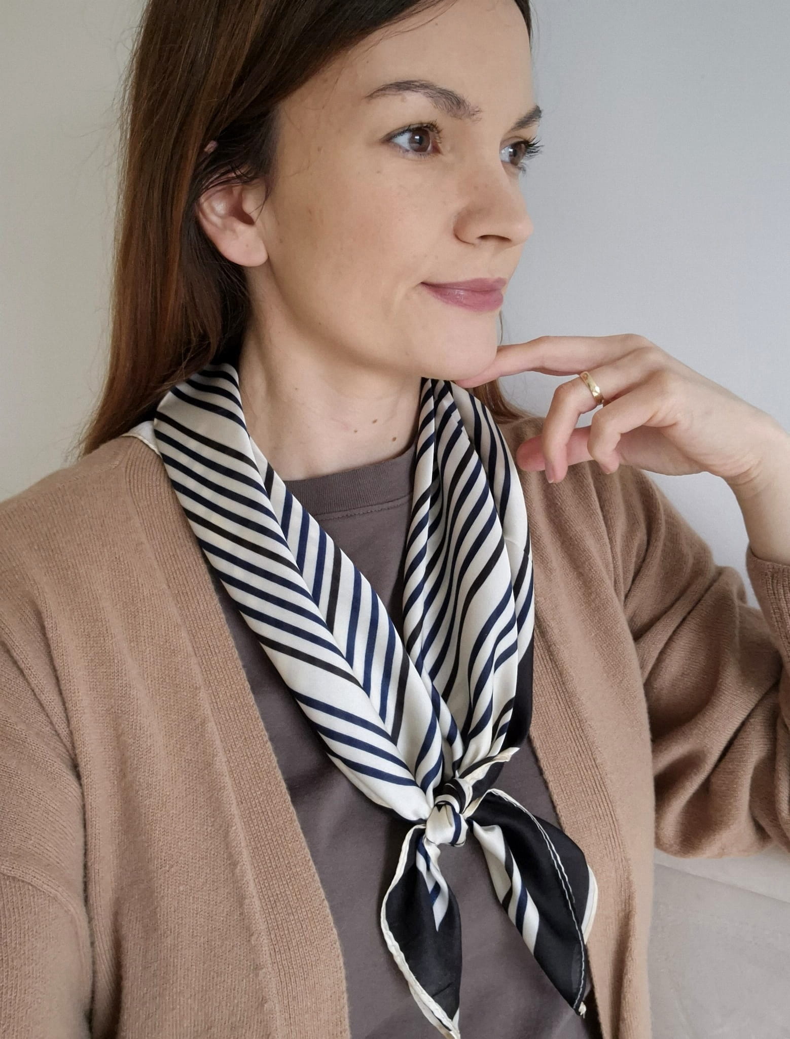Apaszka w dwukolorowe paski została zaprojektowana z myślą o kobietach, które cenią prostotę, elegancję i ponadczasowy styl.