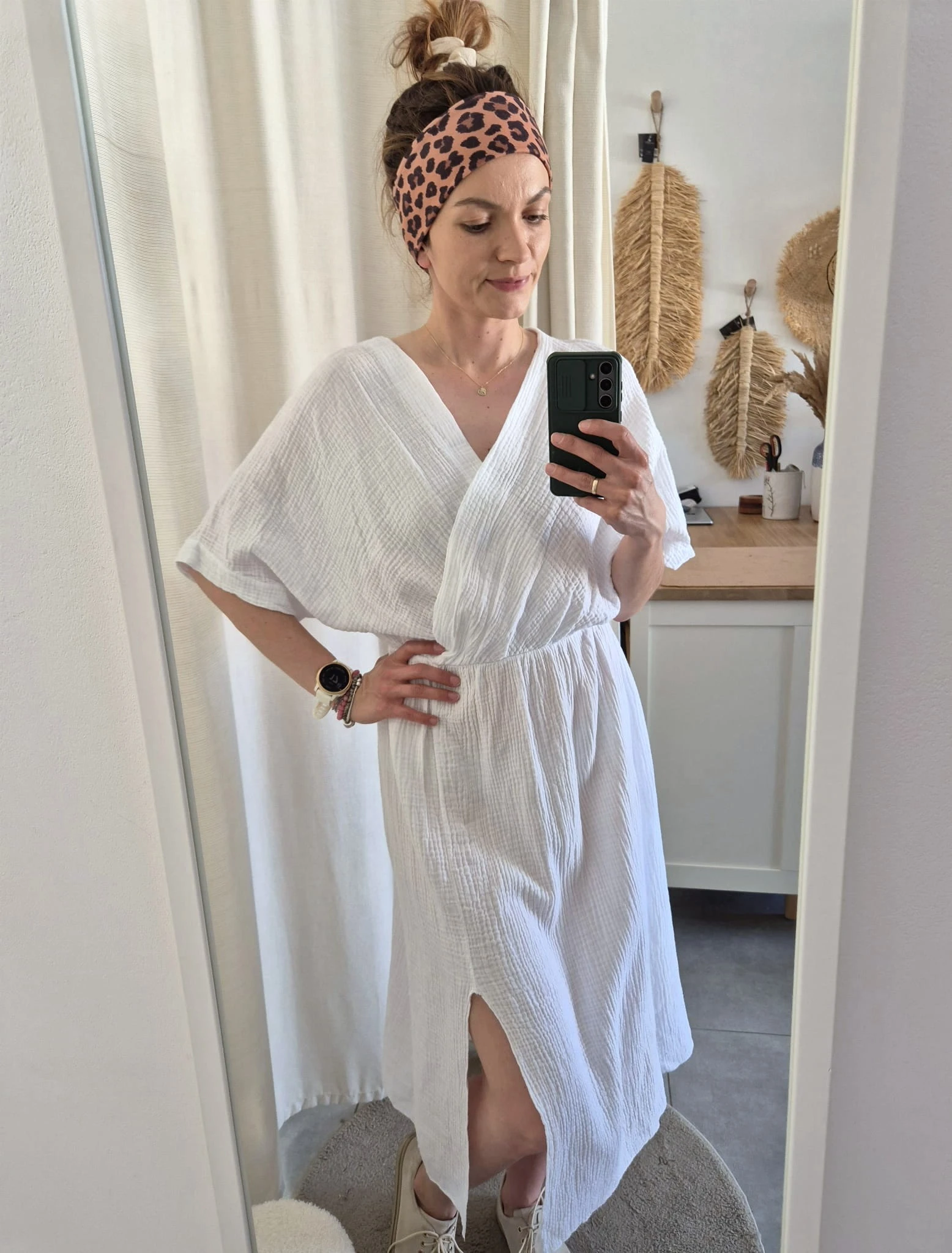 Letnia sukienka wykonana z przewiewnego muślinu to idealna propozycja na ciepłe dni. Lekka i przyjemna w dotyku tkanina z naturalnej bawełny zapewnia komfort noszenia, a kopertowy dekolt pięknie podkreśla linię szyi i ramion. Elastyczna talia dopasowuje się do sylwetki, tworząc kobiecą i wygodną formę. Luźny, lekko rozkloszowany dół oraz krótszy rękaw nadają sukience swobodnego, wakacyjnego charakteru.