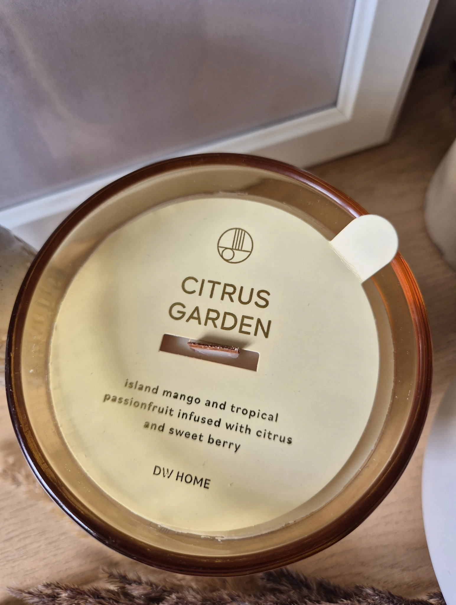 Citrus Garden to energetyzująca mieszanka, która przenosi w sam środek egzotycznego ogrodu. Zapach opiera się na orzeźwiającej nucie marakui i słodkiej pomarańczy, które dopełnia aksamitny aromat dojrzałej papai. Kompozycja jest radosna, intensywnie owocowa i pełna słońca. Całość wzbogaca drewniany knot, który podczas spalania wydaje subtelny dźwięk skwierczącego drewna, dodając egzotycznej atmosferze wyjątkowego, przytulnego charakteru.