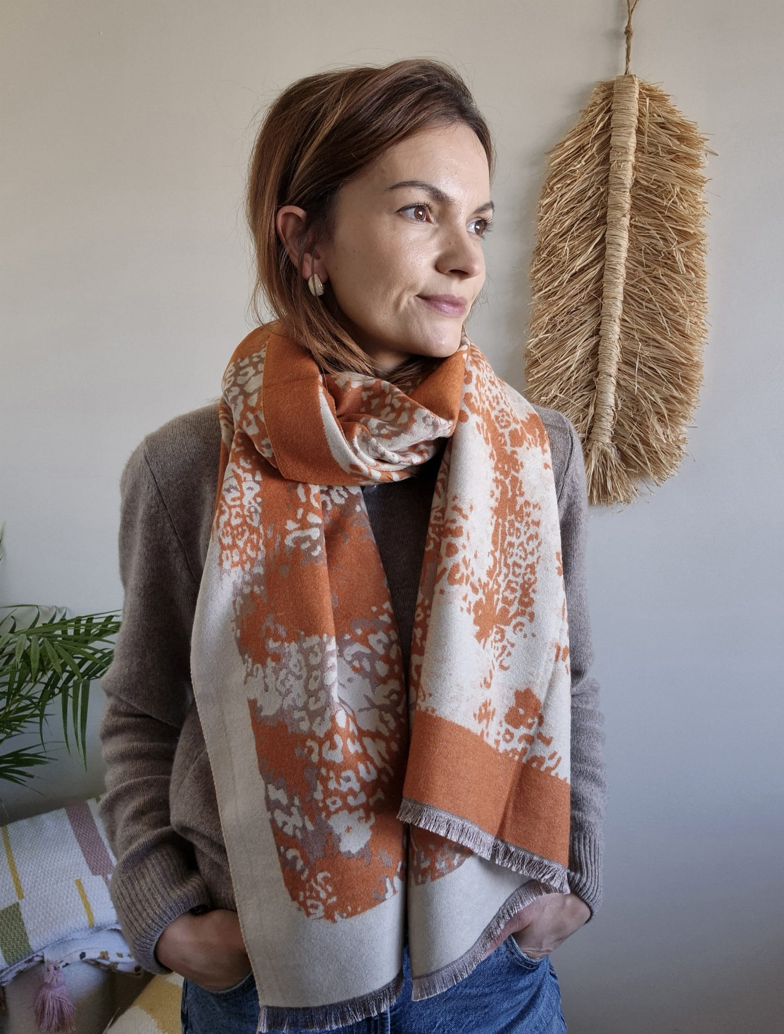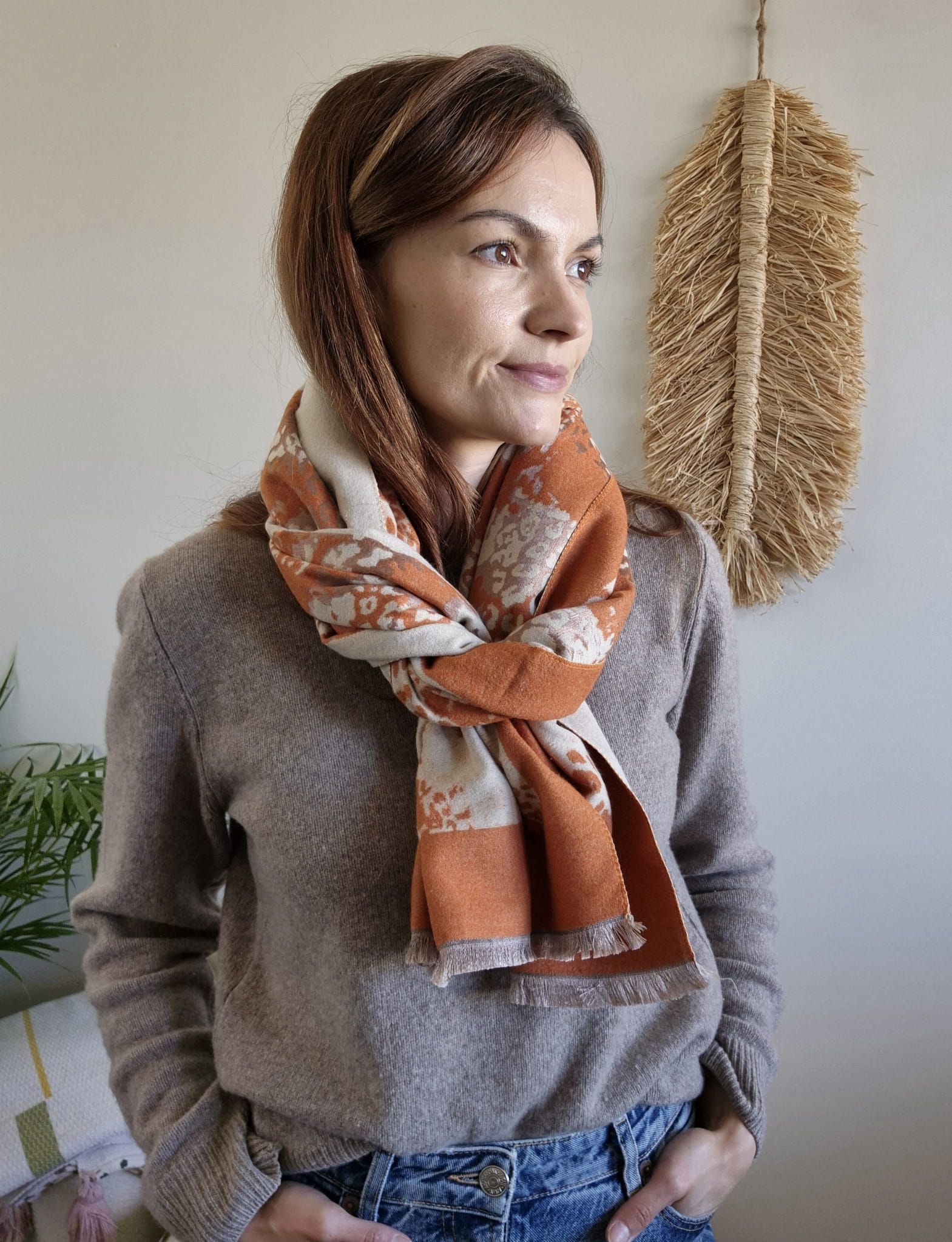 Dzięki starannie dobranym barwom pasuje zarówno do stonowanych, jak i bardziej wyrazistych outfitów, wprowadzając do nich przytulną, jesienną atmosferę.