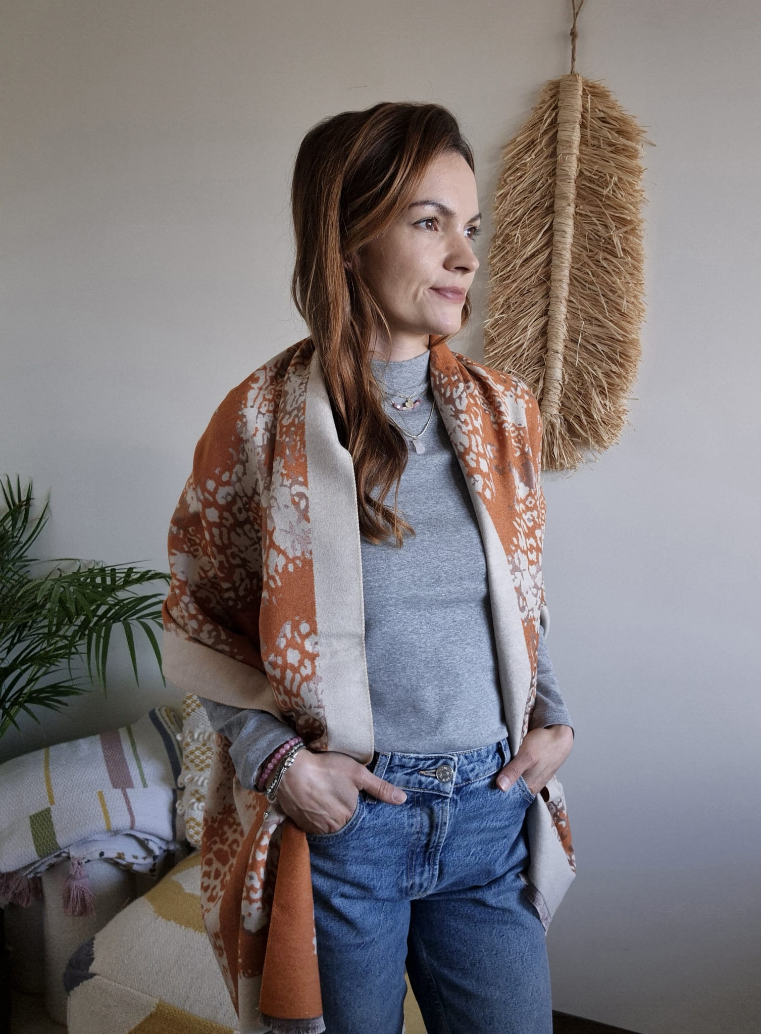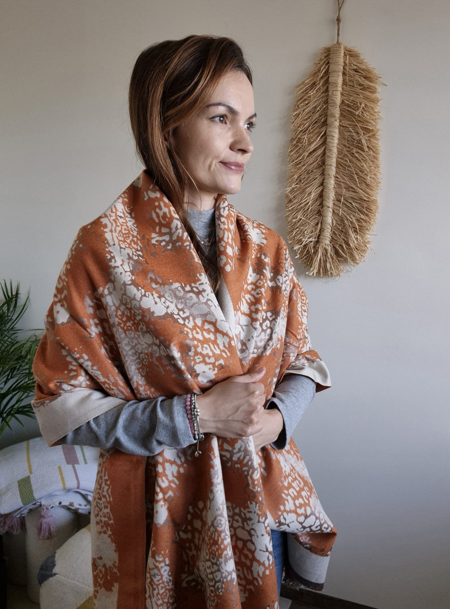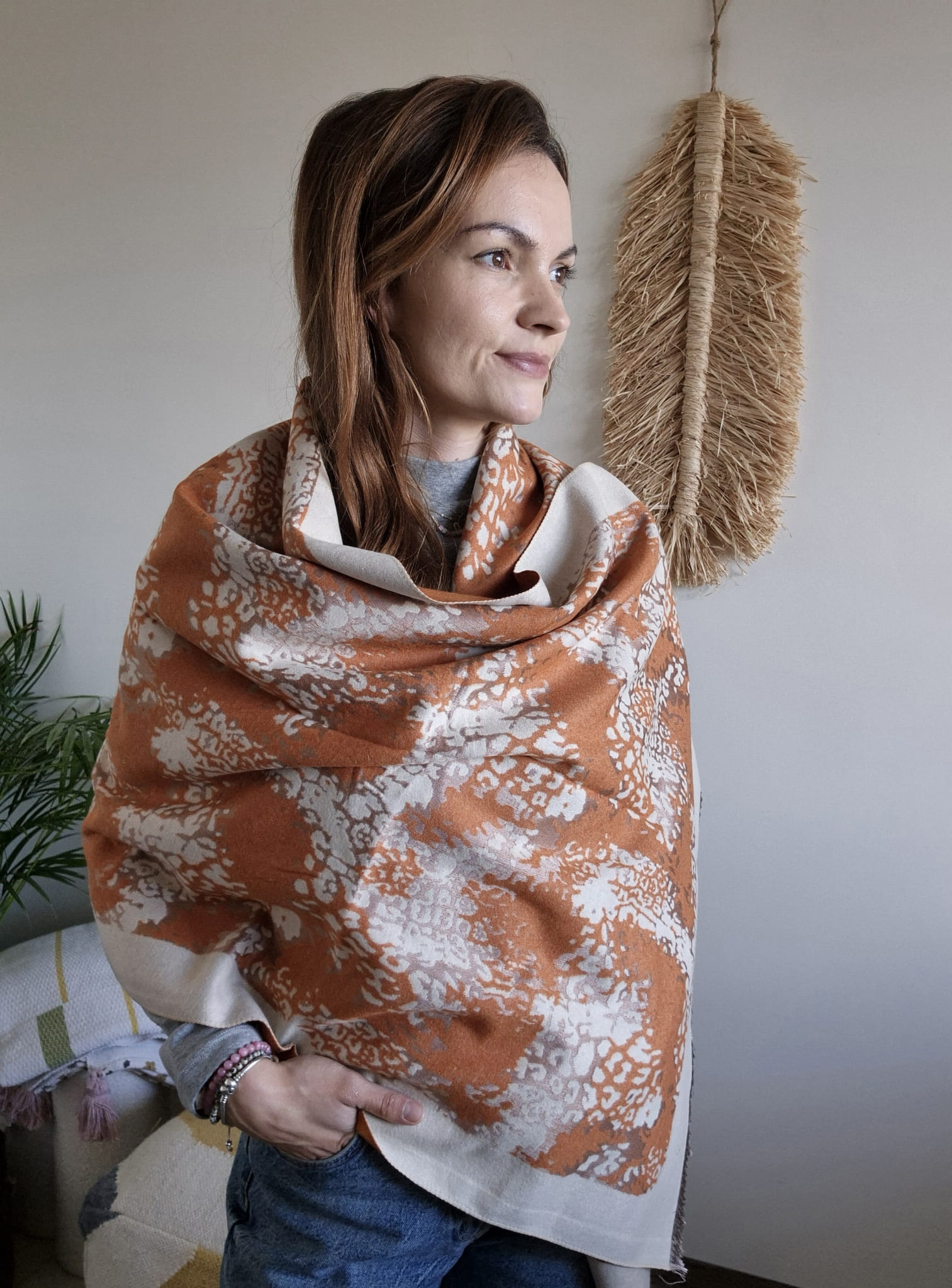 Szal jesienny wykonany jest z naturalnego, miękkiego materiału, który zapewnia komfort i przyjemne otulenie.