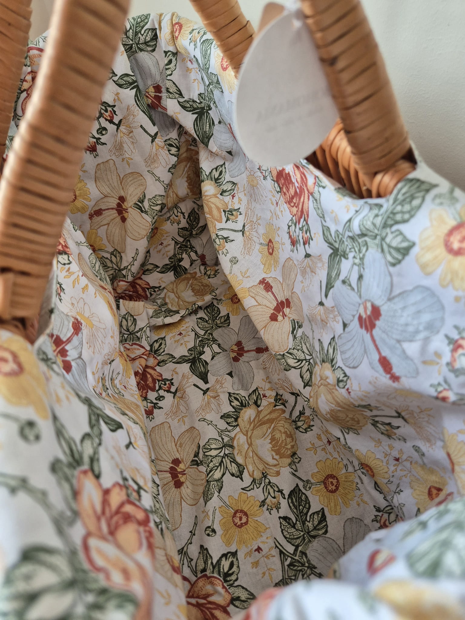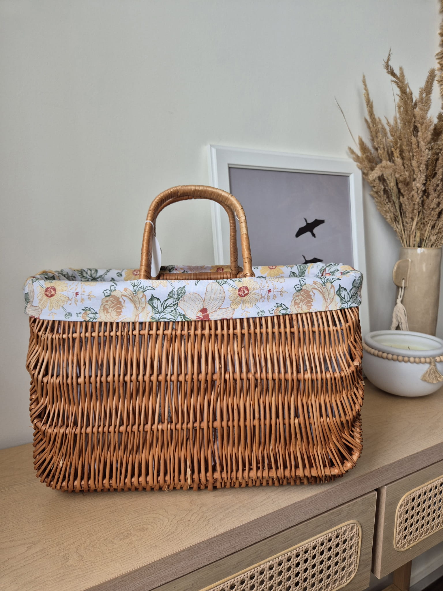 Ręcznie pleciony koszyk z naturalnej wikliny to ponadczasowy dodatek, który łączy funkcjonalność z naturalnym, boho stylem. Subtelna, materiałowa wyściółka w kwiatowy wzór wprowadza delikatny, letni akcent i dodaje koszykowi wyjątkowego uroku.