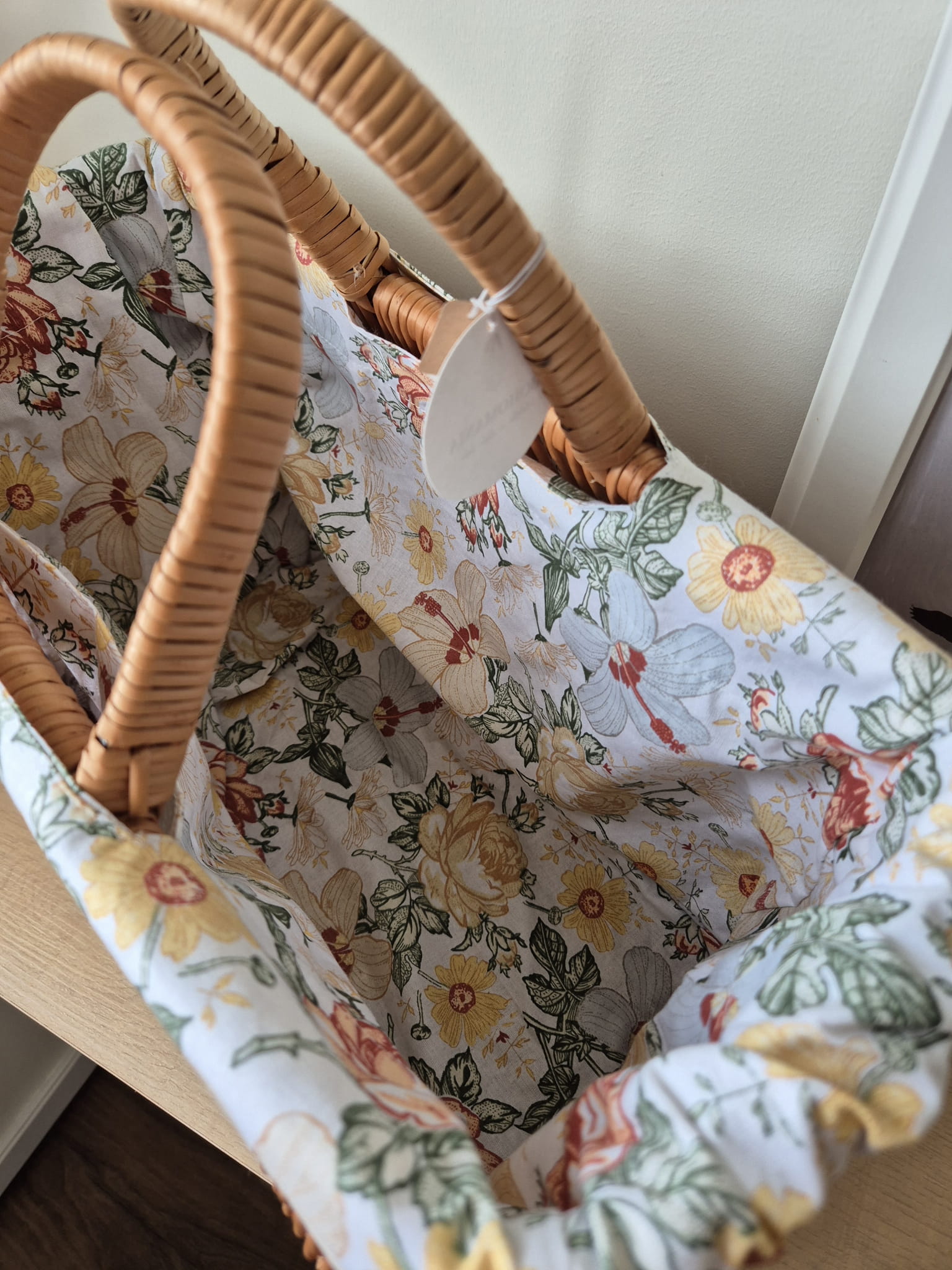 - Materiał: naturalna wiklina, materiałowa wyściółka w kwiatowy wzór