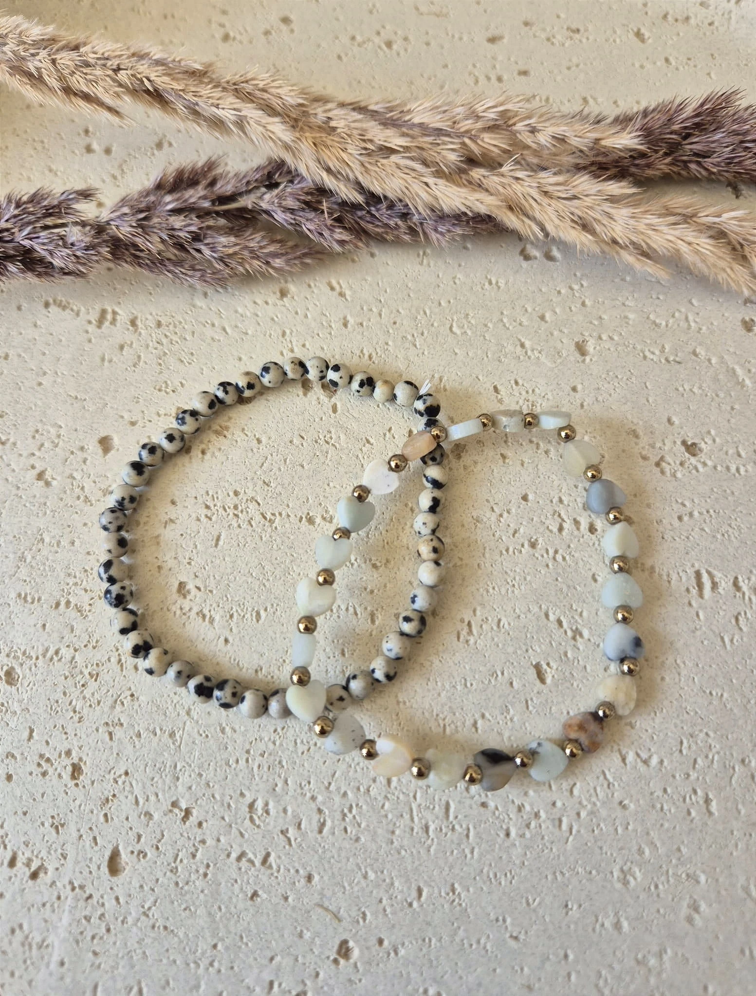 Połączenie charakterystycznego, nakrapianego jaspisu dalmatyńskiego z miętowo-turkusowym amazonitem to duet, który wprowadza do codzienności więcej luzu i odwagi. Jaspis dalmatyński pomaga cieszyć się z małych rzeczy i pobudza kreatywność, natomiast amazonit działa kojąco na system nerwowy, pomagając z uśmiechem pokonywać lęki i codzienne wyzwania. To biżuteria, która dodaje skrzydeł i przypomina o tym, by kroczyć przez życie z wiarą we własne możliwości.