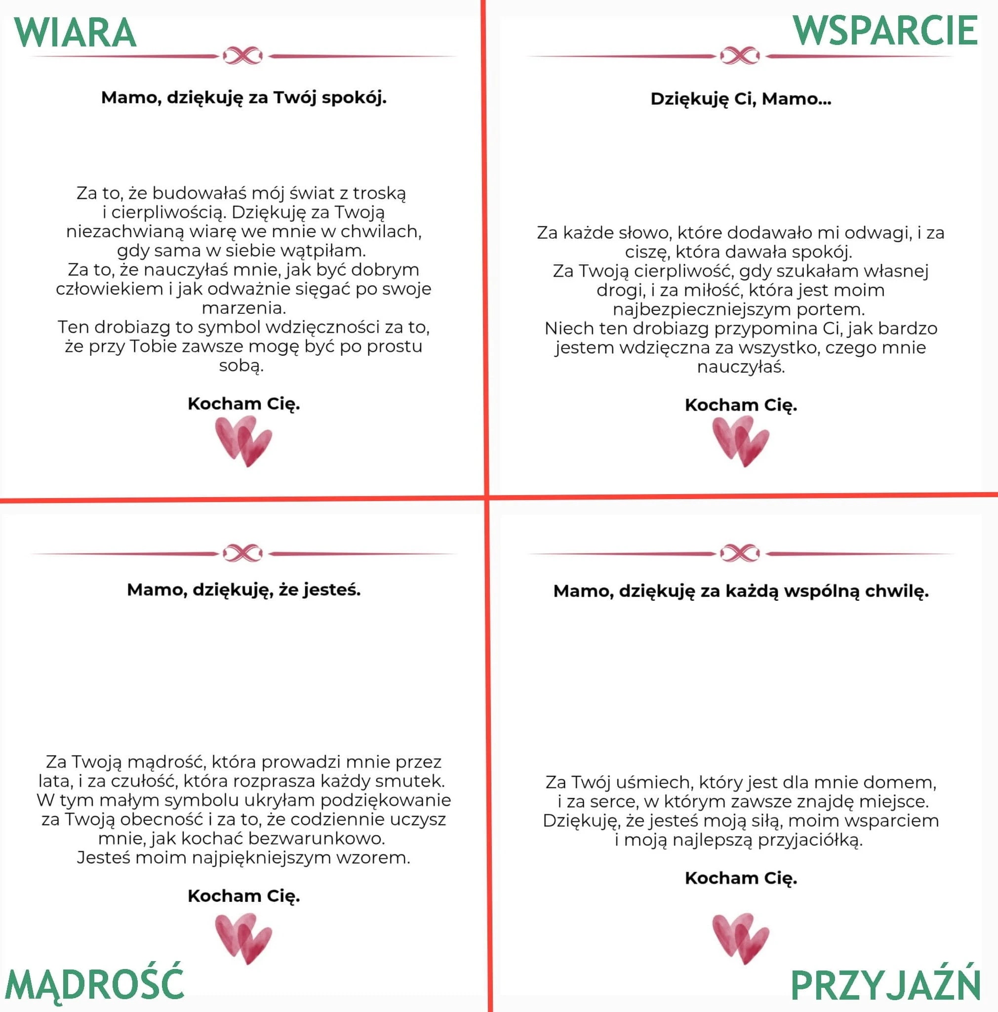 Wybór jednej z czterech dedykacji sprawia, że ten upominek zyskuje wyjątkowy, sentymentalny charakter. W małym pudełeczku możesz zamknąć wdzięczność za wsparcie, mądrość, przyjaźń lub wiarę, którą Mama każdego dnia wkłada w Waszą relację. Dzięki spójnej oprawie i gotowej karcie z tekstem, otrzymujesz kompletny prezent, który wzrusza i zostaje z bliską osobą na lata.