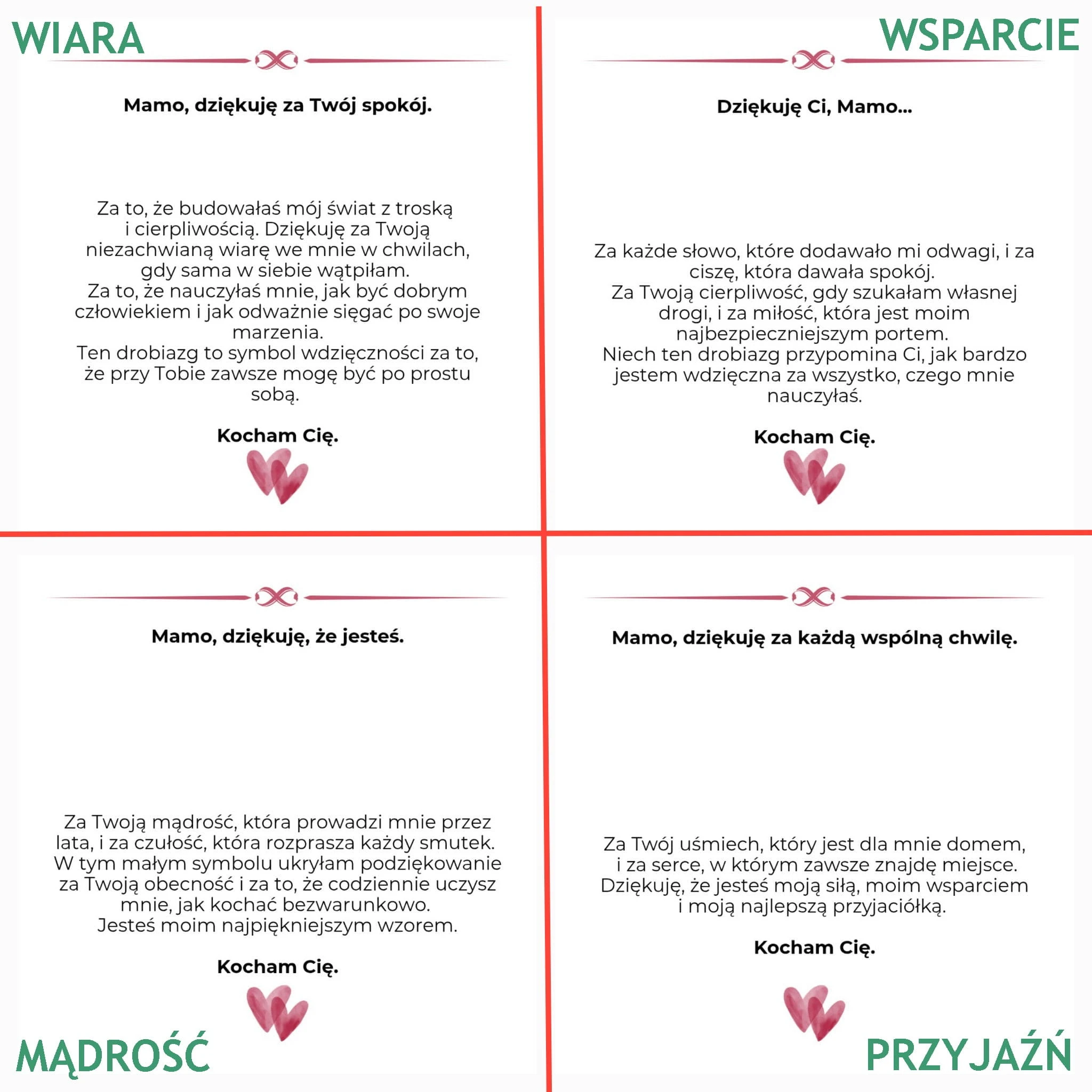 Wybór jednej z czterech dedykacji pozwala zamienić te bransoletki w prezent pełen słońca i dobrych życzeń. Wewnątrz eleganckiego pudełeczka Mama znajdzie słowa, które najlepiej opisują Waszą relację – podziękowanie za jej mądrość, wsparcie, przyjaźń lub wiarę, która zawsze dodaje Ci skrzydeł. Otrzymujesz kompletny upominek, gotowy do wręczenia, który rozjaśni każdy krok najważniejszej kobiety w Twoim życiu.