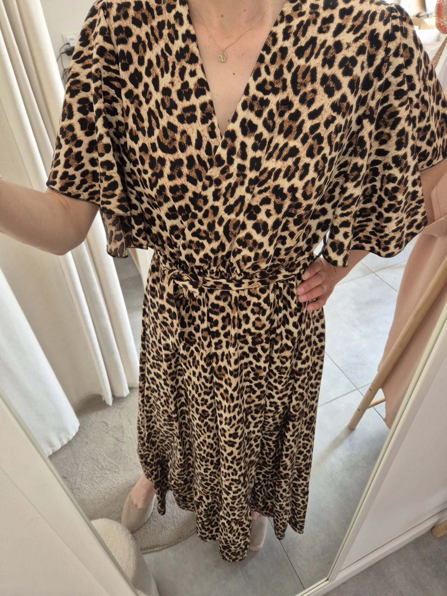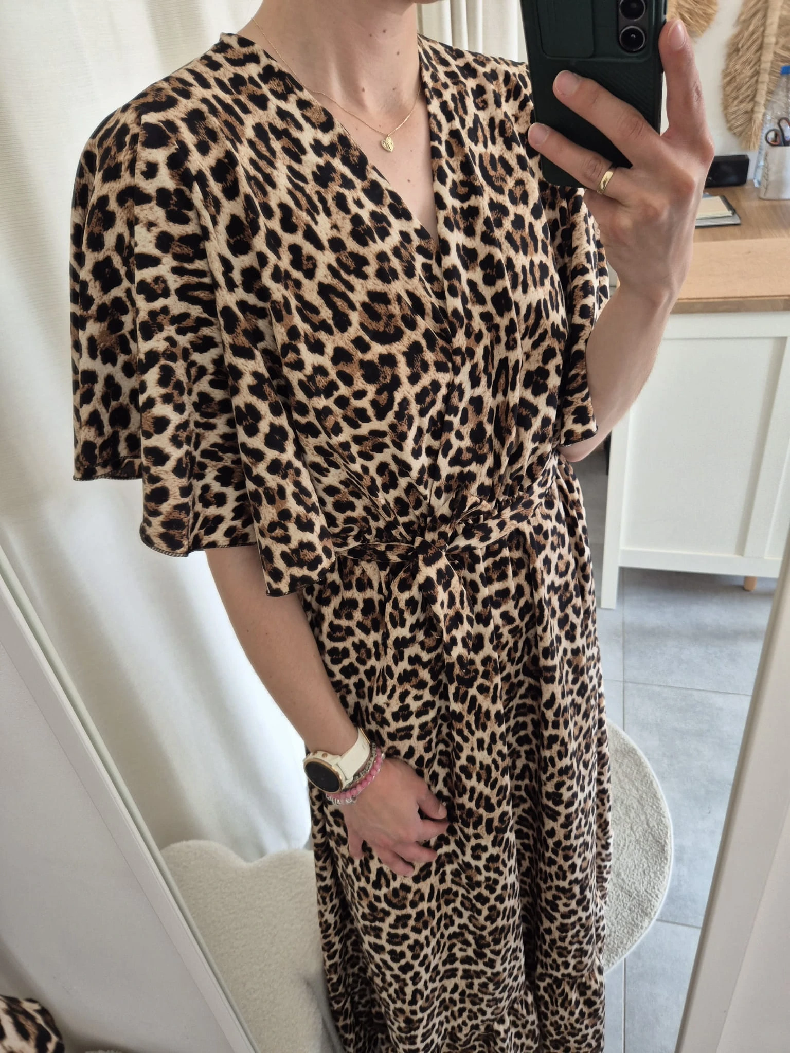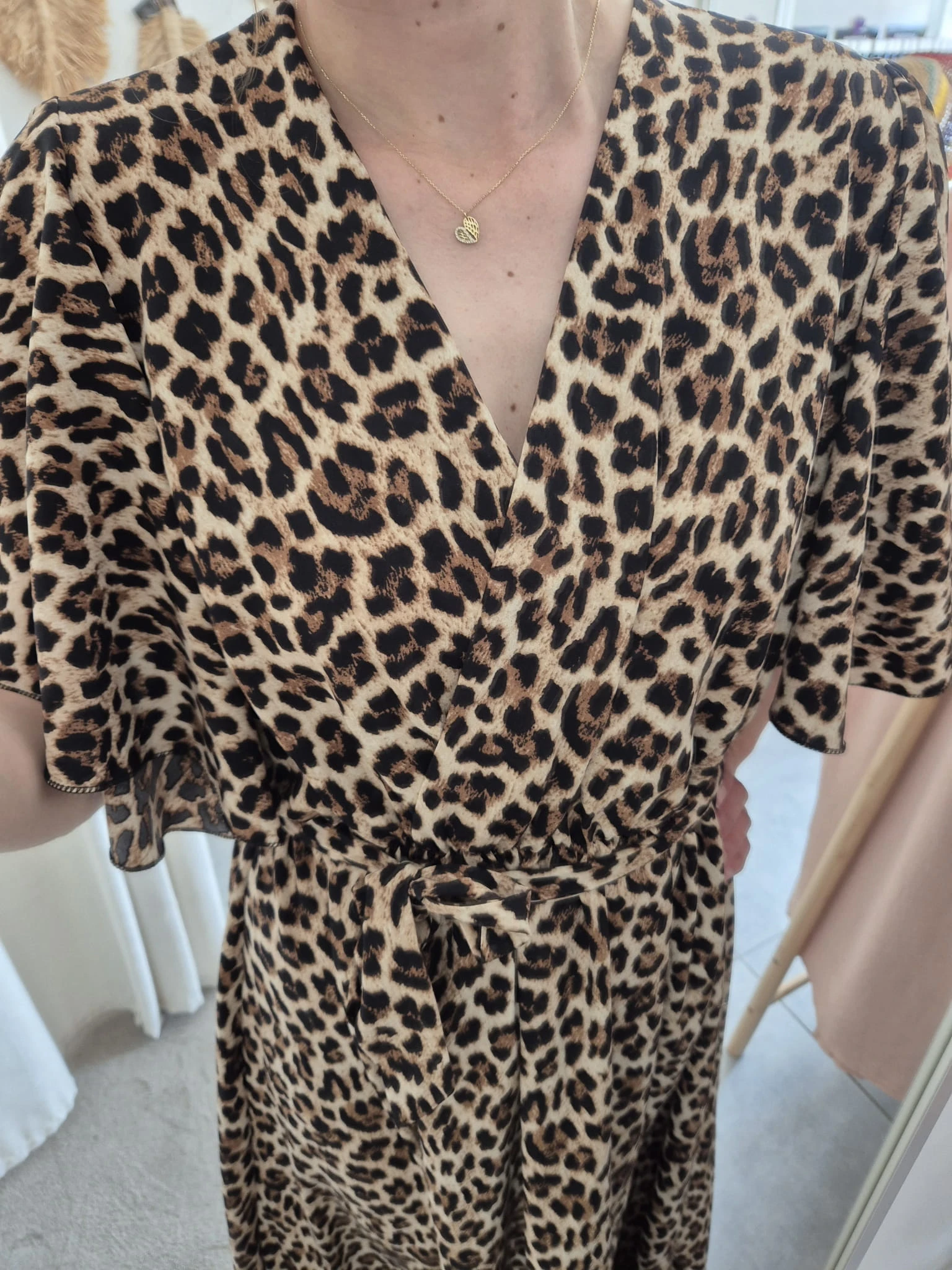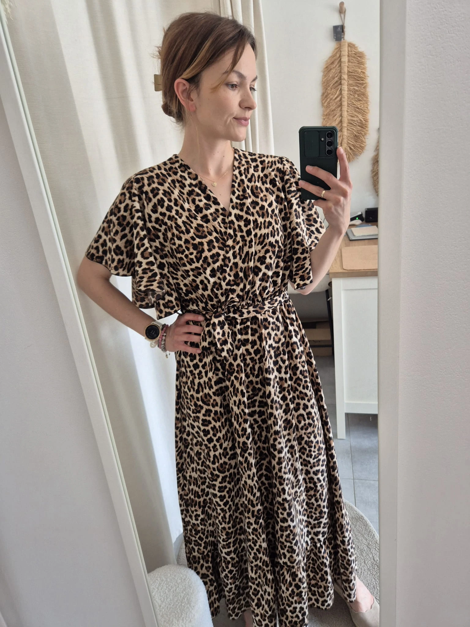Sukienka Maxi w Panterkę – Kopertowy Dekolt i Pasek | Wiskoza