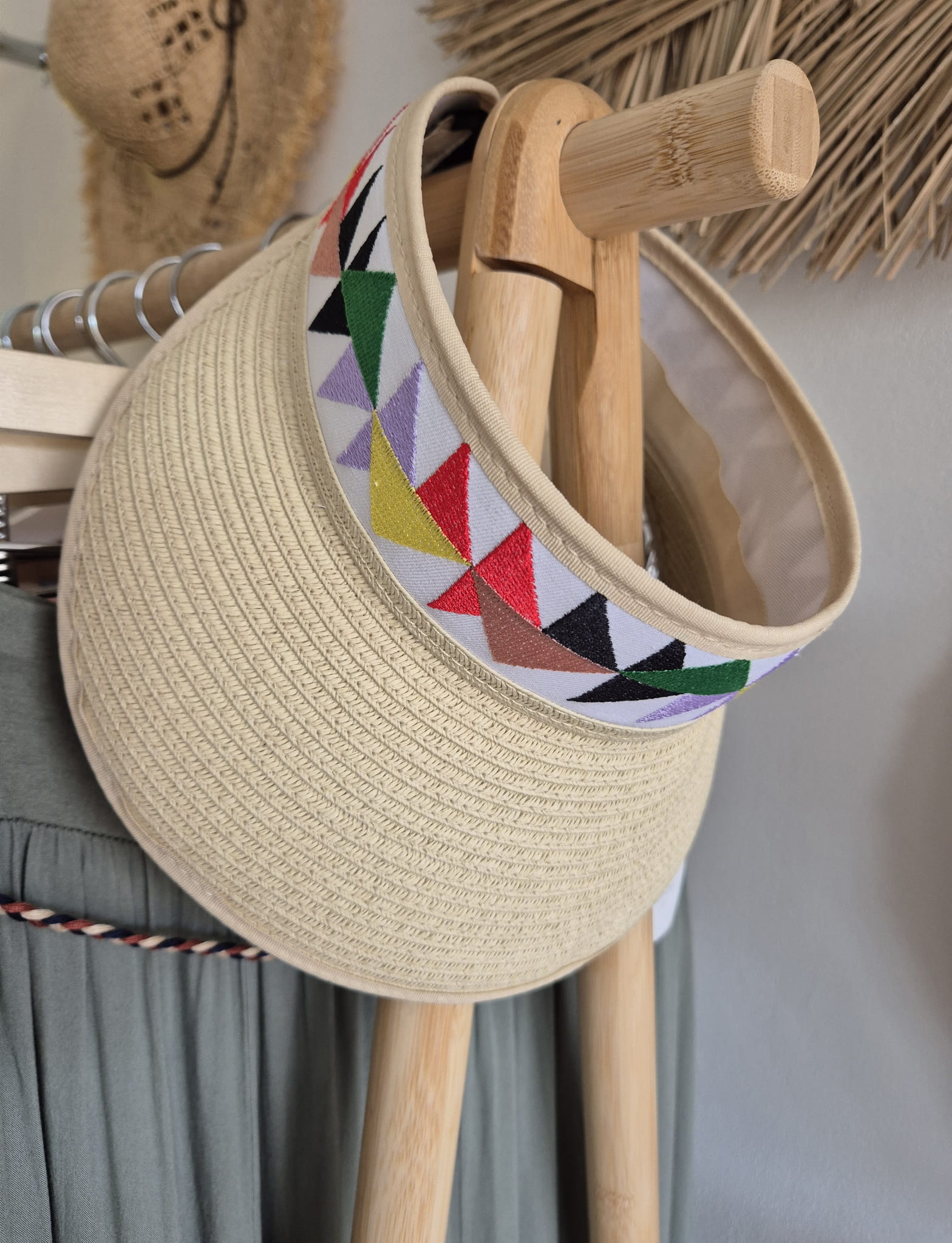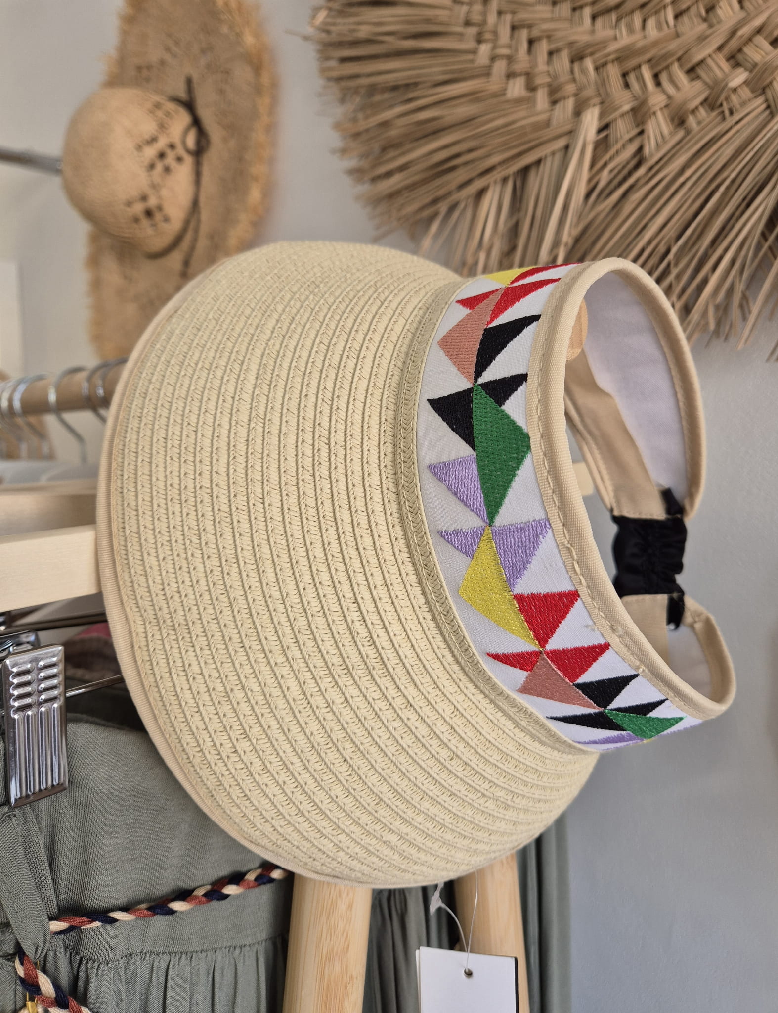 Lekki, przewiewny daszek przeciwsłoneczny to idealny wybór na lato – zarówno na wakacyjne wycieczki, jak i aktywności na świeżym powietrzu. Wykonany z naturalnego materiału - 100% papier, wyposażony w elastyczną gumkę z tyłu, dzięki czemu dopasowuje się do obwodu głowy i zapewnia komfort noszenia. Ozdobna tasiemka w geometryczne wzory dodaje mu charakteru i oryginalności.