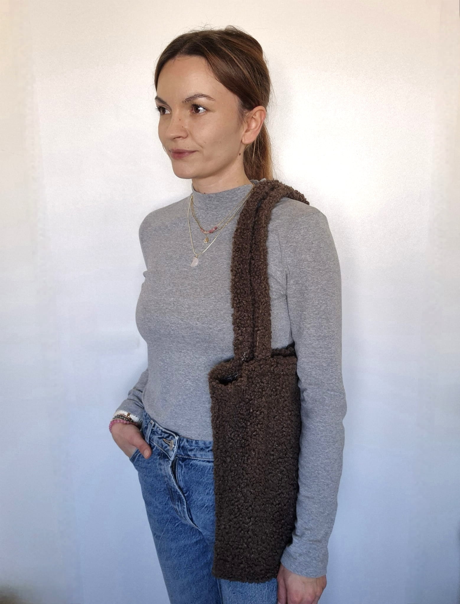 Materiał o strukturze bouclé sprawia, że torba wygląda przytulnie i oryginalnie. Świetnie komponuje się z płaszczem, swetrem czy luźną stylizacją w duchu boho.